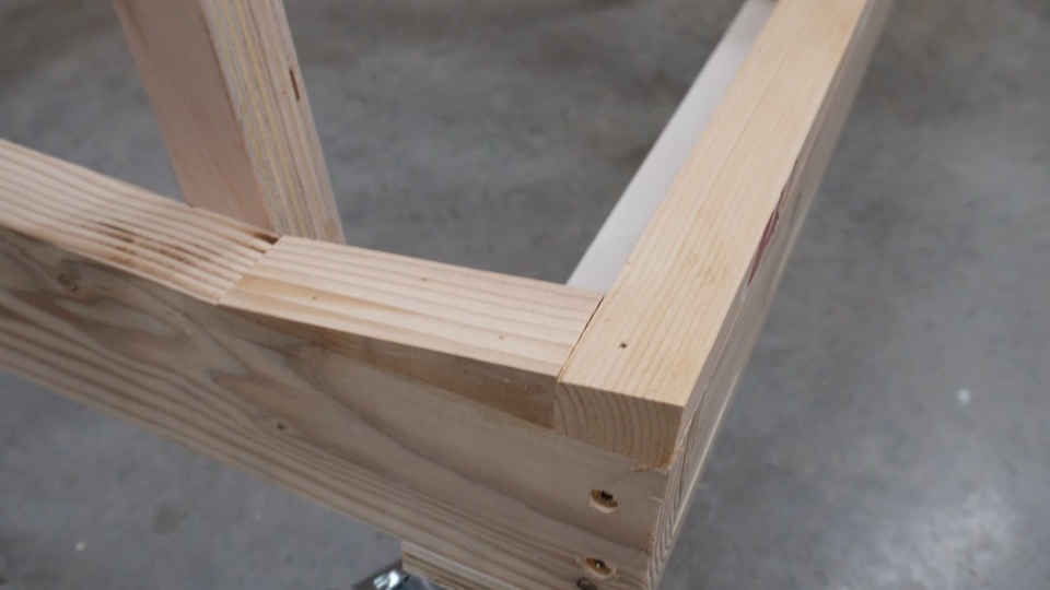 The base frame is made of 2x4s and reinforced with two plywood rails/skids along the bottom.