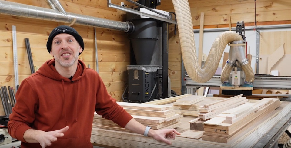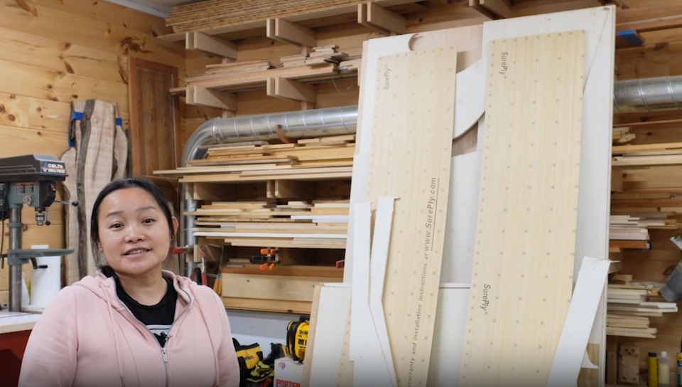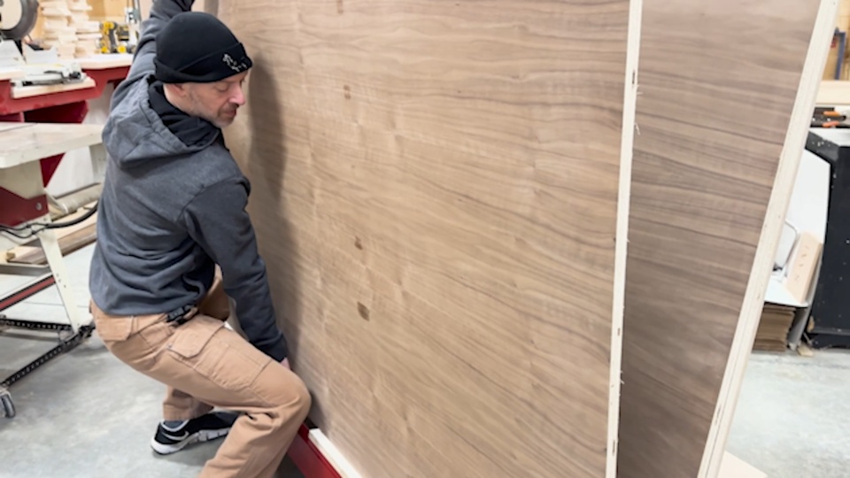 But then we remembered we wanted to separate partial plywood sheets from full sheets, so we created a revision and designed this. Where one side could store the partial sheets and still have a few small shelves and a bin for off cuts.