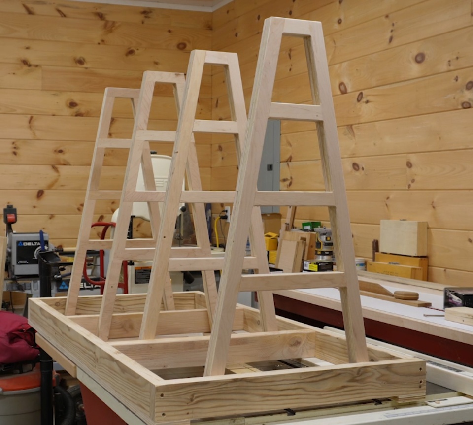 To support the full and partial sheets that will live on the outside of the A-frames, we used thicker, 3/4" pieces. At the bottom, we cut wedges to tilt the floor back 10 degrees and maintain a 90 degree corner where it meets the uprights.