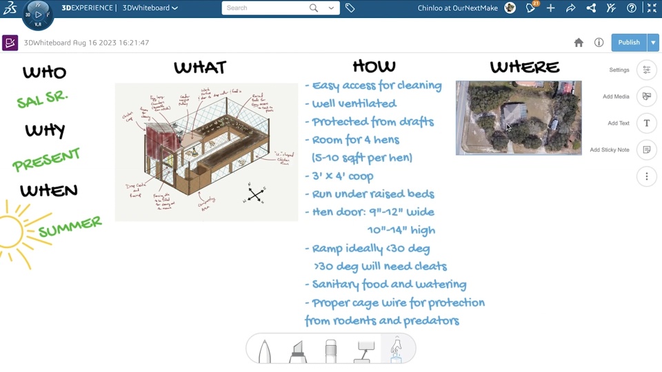 This year, we decided to build him a chicken coop so he could realize his dream. We brainstormed and captured our research in a 3D Whiteboard...