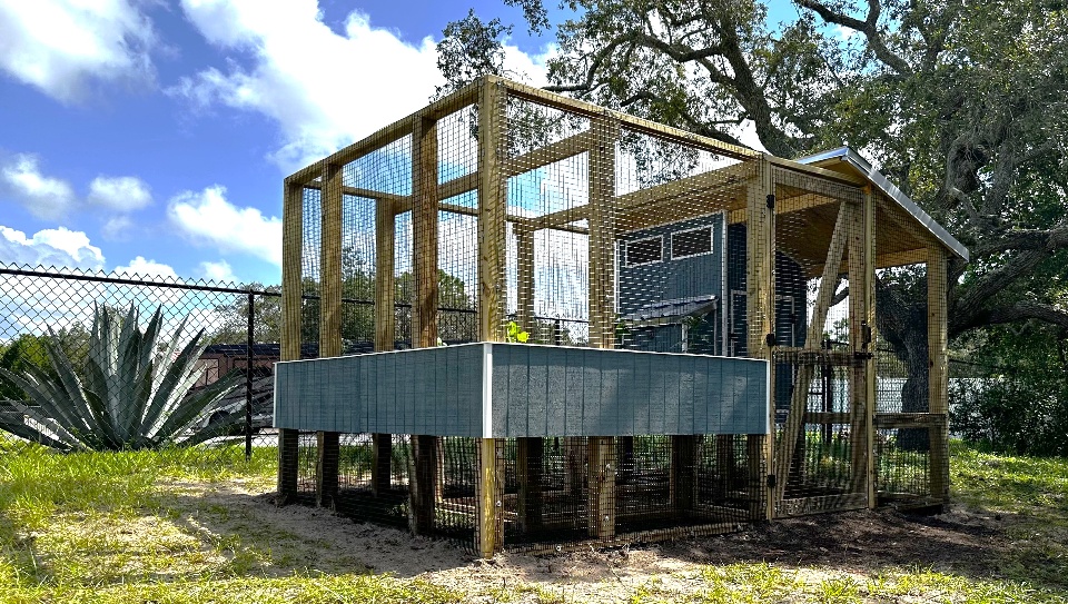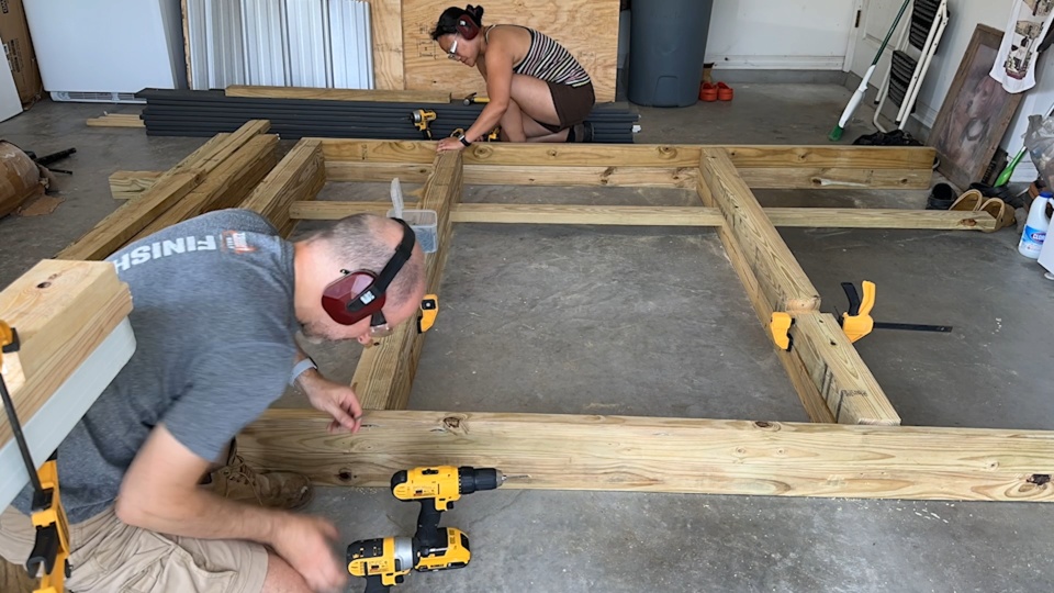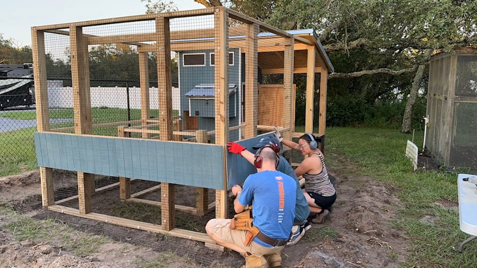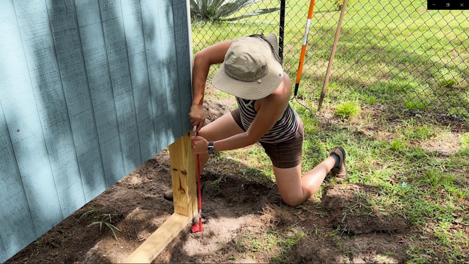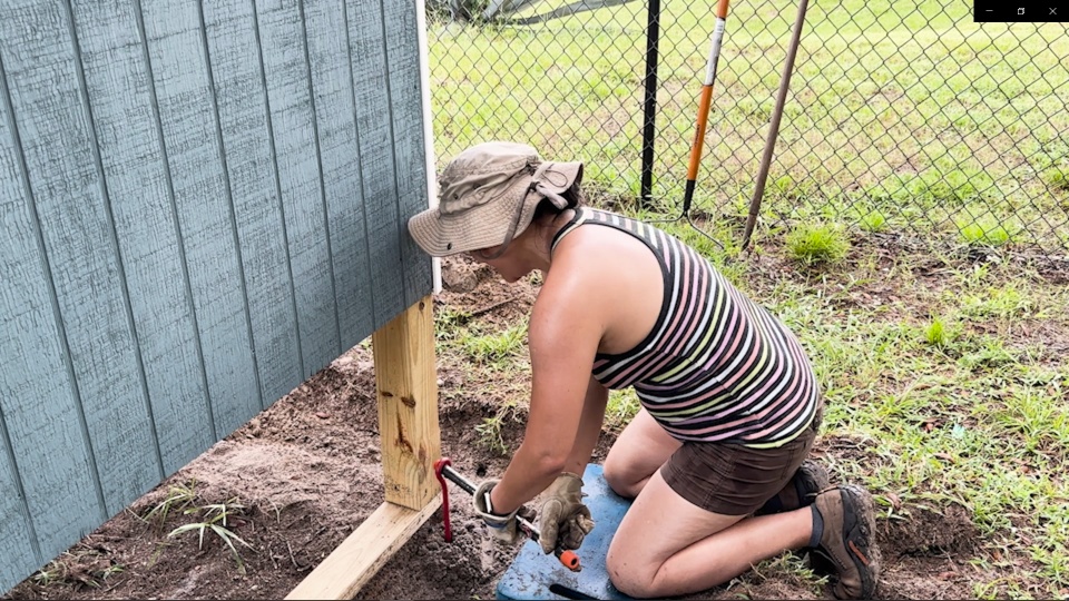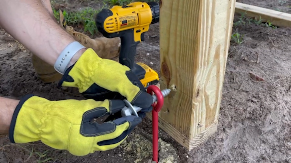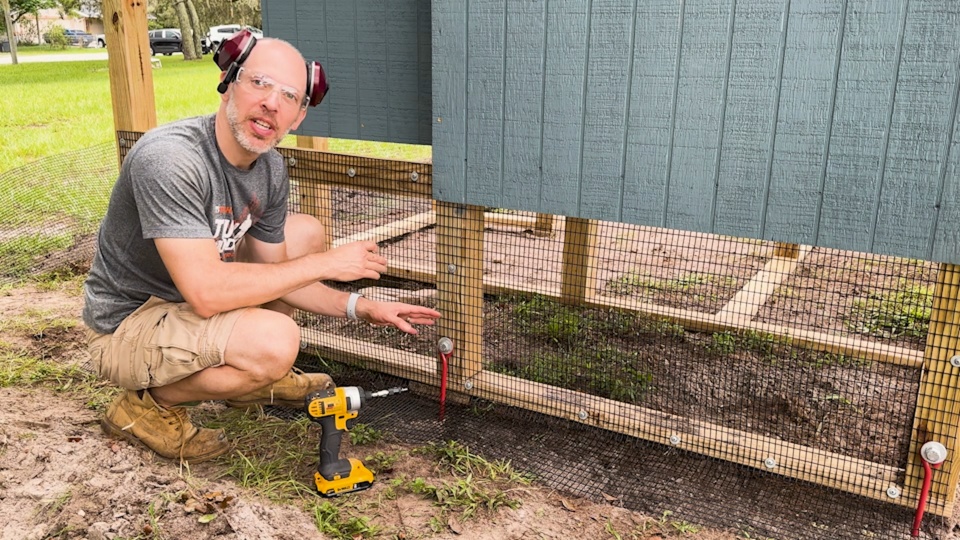 Then we prebuilt large wall sections in the garage before carrying them out to the yard to assemble. We made sure to get everything level and square before we started to attach the protective wire fencing. The product we used to keep the chickens safe from predators is 1/2" x 1" welded hardware cloth. It's really tough stuff, and we opted for a PVC coated version that will stand up even better to the elements. The black color also helps it disappear from view a bit, so you can see the chickens, the garden, and the coop much better. To keep the coop safe in high winds, we secured it in place using earth anchors. These cool devices get augured into the ground and then attached to the structure using lag screws.