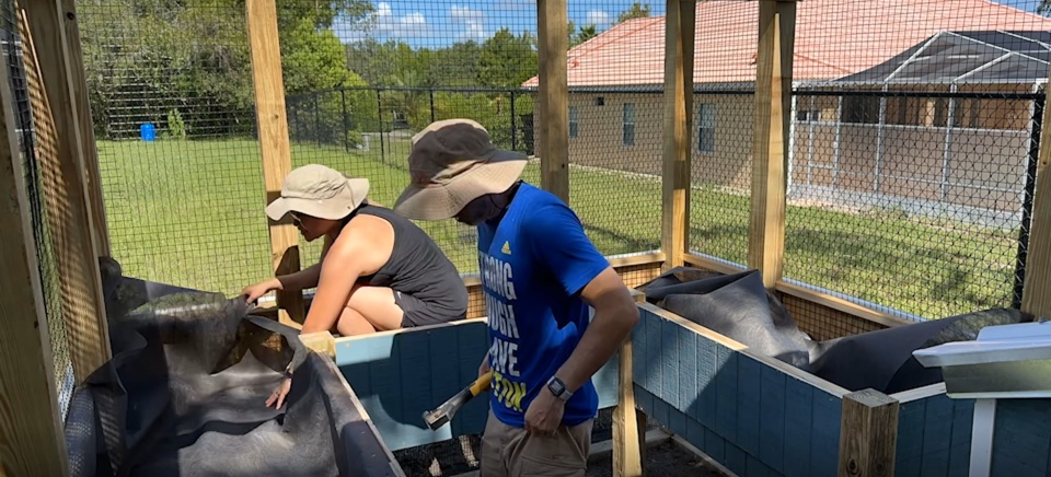 We used composite decking as flooring for the raised beds, and T1-11 as siding. A layer of landscape fabric holds the soil in place and creates an air gap between it and the T1-11.