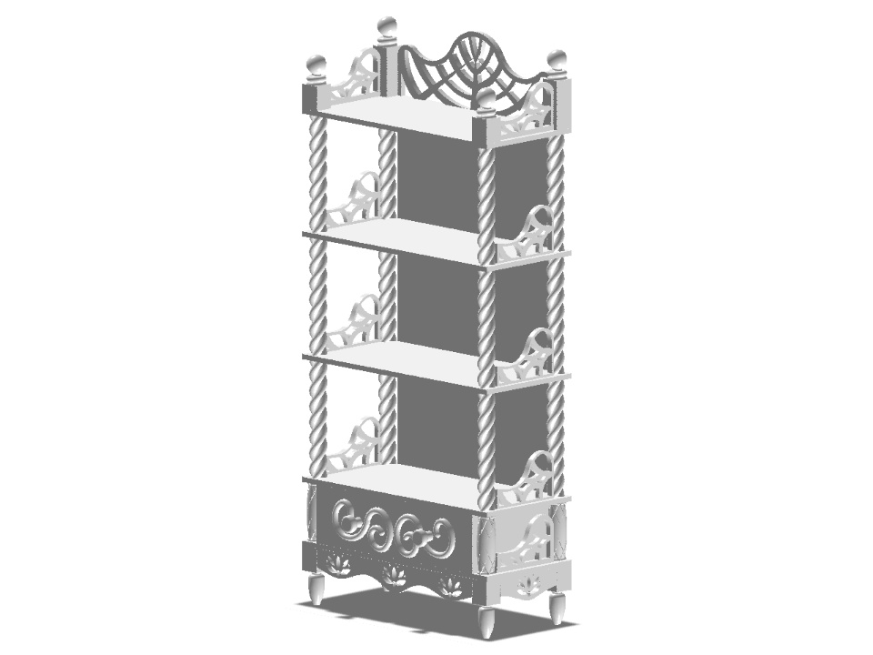 Vintage inspired bookshelf of mahogany and brass. Featuring four shelves and a drawer at the bottom. Made completely in xDesign! The spiral columns were made by sweeping three circular profiles with a twist.