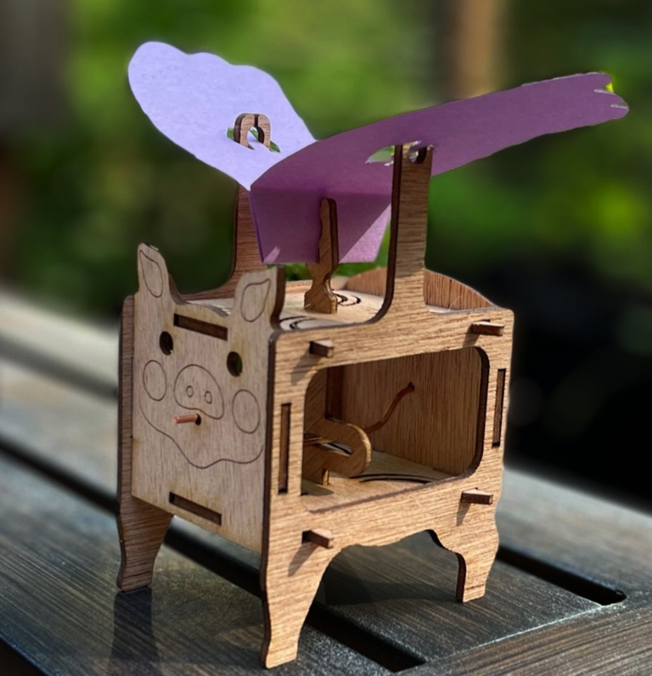We also altered the shape of the automaton as the design progressed. The box shrunk, and then was made to look like a boxy pig, and then finally took on the profile of a pig.