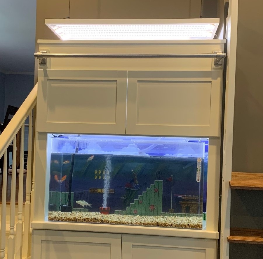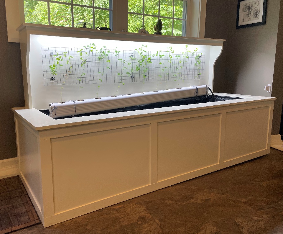 In the last few years, my wife developed an interest in aquaponics - a process of growing food in a closed loop system with fish. We started small with a few, 3 inch long Koi in a 55 gallon tank that supported a small, 6 square foot grow bed. It took a short while to find the right balance, but we managed to reach a nice equilibrium and produce pea shoots, Swiss chard, flowers, and herbs.