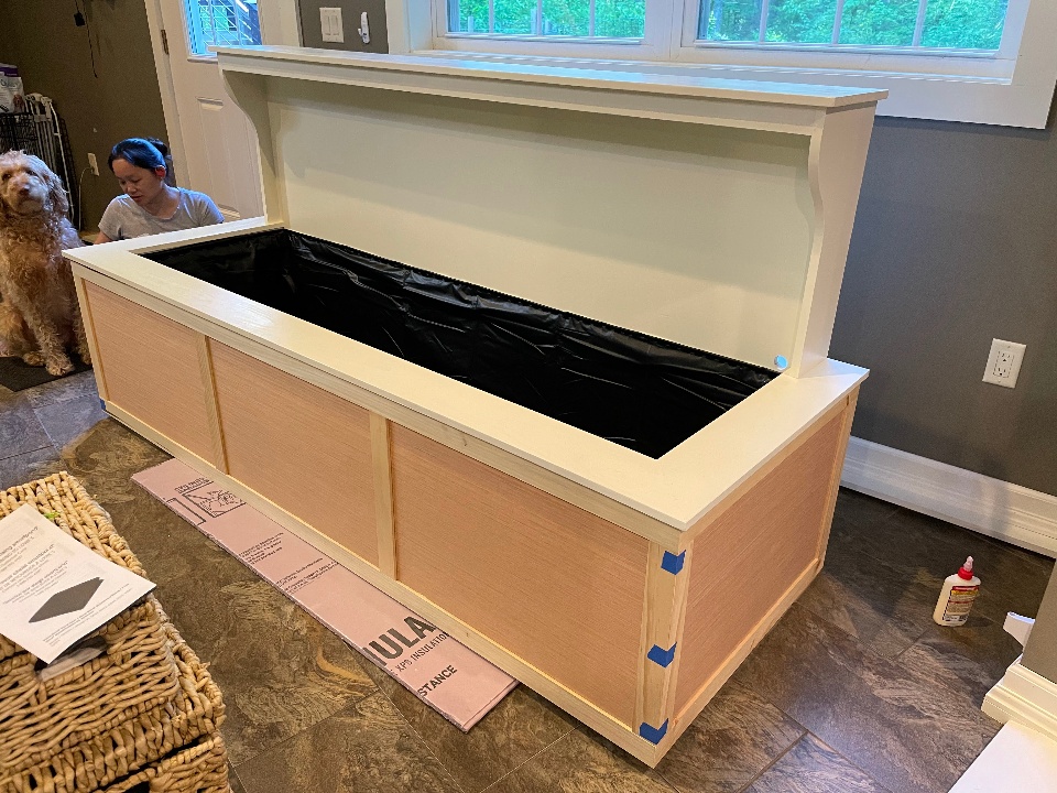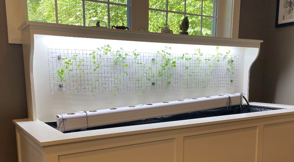We used a standard pond liner to hold the water and, although I was a bit apprehensive about it leaking hundreds of gallons of water all over our house, I am happy to say that it is performing beautifully. A small submersible pump runs continuously and pumps water and 'fish nutrients' to a gutter in which the peas grow.
