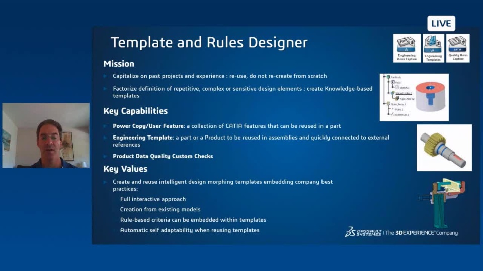 Knowledgeware is one of the key differentiator of CATIA.Through this presentation, Peter and myself will explain how the Knowledgeware roles allow to perform mechanical design automation from concept to detailed design. In particular we focus here on the new xGenerative Design App and on the Engineering Templates capability that you can combine to take benefits from the incredible automation tools of CATIA.