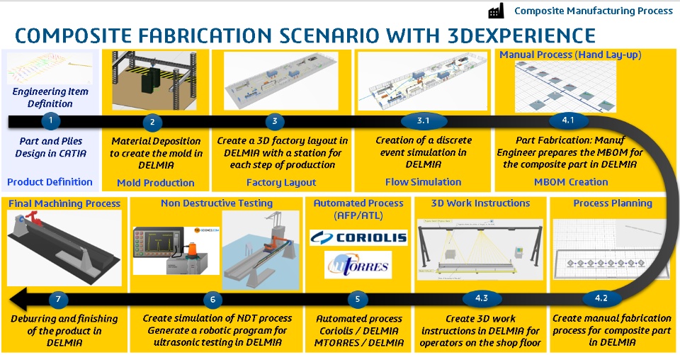 I want to share with you a demonstration created for the JEC World 2023 in Paris which is one of the most important events of the composite industry. The goal of this demonstration is to illustrate how you can use the 3DEXPERIENCE solution to create the manufacturing process of a composite part from plies design to process planning with raw material assignment & consumption, work instructions and machines/robots programs for hand lay-up and automated manufacturing processes such as FGF (material deposition), ATL, AFP, NDT, contouring.