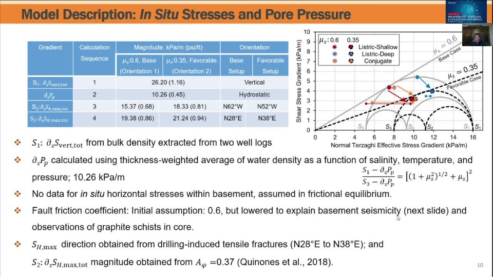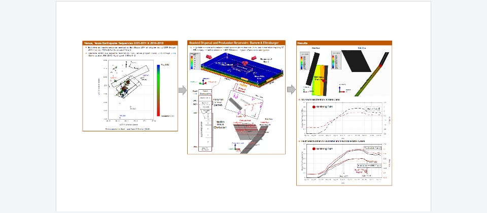 This presentation is about a piece of research work that I conducted as a postdoctoral fellow at the Bureau of Economic Geology at The University of Texas at Austin. I will talk about a mechanism for the subsurface fault slip as a result of surface petroleum industry operations. A visual flowchart of this study, as shown in the figure, is described as: (1) interpretation of the prone fault for reactivation based on the earthquake hypocenters; (2) building an Abaqus poroelastic model based on the interpreted fault, stratigraphy, in-situ stress and geomechanical properties, and well data; and (3) running the simulations on the Texas Advanced Computing Center (TACC) clusters, post-processing, and plotting results. Briefly, these results demonstrate the capability of a poroelastic model to simulate a causative mechanism for fault reactivation in a field scale problem: pore-pressure increase fully coupled with poroelastic stress changes over the fault core, leading to the reduction of the fault frictional strength up to a threshold determined by the Mohr-Coulomb failure criterion. For further details, please refer to the abstract after the figure.