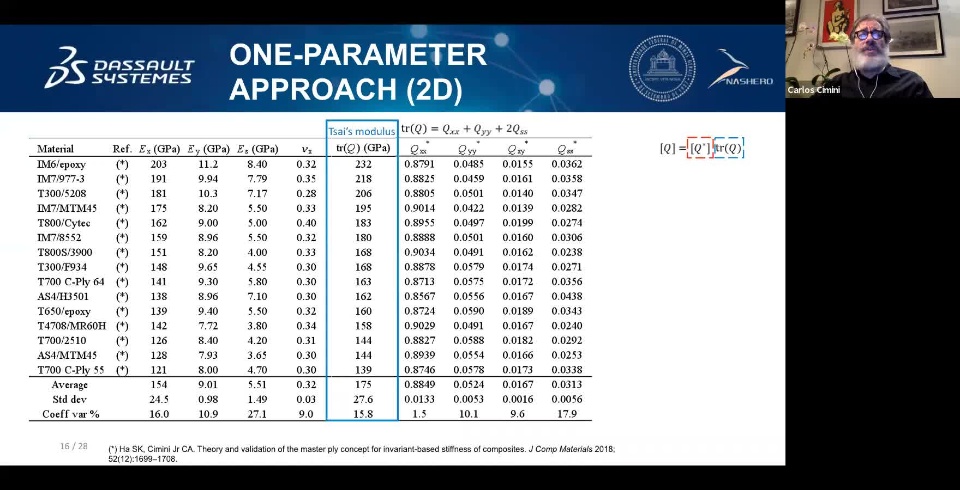 In every single simulation, analysts face the necessity to input the material elastic constants into their models. It may not be difficult for some people to determine 3D stress and strain fields for laminated composite materials. However, with so many elastic constants to input, it is difficult to know their values. It turns out that the Tsai's modulus in 2D [4] can be extended to 3D in a straightforward fashion. As a result, there exists a master ply from which one solution is sufficient for all materials by scaling with Tsai's modulus [1-4]. This modulus is the trace of the elastic stiffness in C that is modified to take into account the use of engineering shear moduli; thus, Tsai’s modulus = C11 + C22 + C33 + 2C44 + 2C55 + 2C66. In Figure 1, comparison of 3D universal stiffness C* and 2D universal stiffness A* for laminate [02/±45] shows the invariance of their components as function of the trace for 11 different CFRP material systems. Both were normalized by Tsai’s modulus. It can be seen the marginal increment of universal stiffness for the 3D case and also that the master ply concept can be applied to both ply stiffness C* and laminate stiffness A*.The 3D laminate stiffness A* can be also partitioned to a fraction of its components. It turned out that the in-plane stiffness components correspond to 86% and the remaining out-of-plane, 14%. Figure 2 shows these 2D vs. 3D proportions of 3D stiffness A* for 15 different CFRP material systems considering several layups. The accuracy is less than 2%. Experimentally it is only necessary to measure one constant, i.e., the Tsai's modulus, from which all diagonal components of the 3D stiffness can be scaled, with 2% accuracy. There are other invariants that can used to determine the off-diagonal components with the same degree of accuracy. The bottom line is, with the recognition of the existence of the Tsai's modulus for 3D stiffness, confidence in the stress analysis is increased and solution based on one material can be scaled for all other CFRP. There is no need for recalculation. Moreover, master ply concept relies on one-parameter input: the unidirectional ply longitudinal modulus (Ex), which defines the Tsai’s modulus and, therefore, the particular CFRP material system.