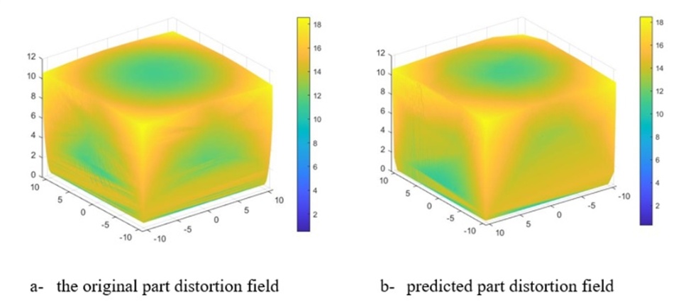 Due to the underlying complex multi-physics systems, the spatiotemporal thermal cycles in additive manufacturing technology pose difficult challenges to validate the simulation models obtained from the finite element analysis (FEA). The spatiotemporal different thermal cycles lead to residual stresses and non-uniform part distortions within the additively manufactured part, which could detrimentally impact its adaptation in functional applications. Moreover, the conventional modeling using partial differential equations (PDEs) implemented through FEA is mitigated by the massive numerical calculations and exhausted by the system’s curse of dimensionality. In this study, a data-driven modeling approach was developed to simulate the distortion within the additively manufactured part effectively. The part distortions history was collected from different AM building strategies using finite element simulations. The FEA model consists of the multi-layer part distortion as targets for AM process parameters. The novel theme consists of two stages: (1) self-organized map (SOM) to project the high-dimensional spatial for the part distortion into likelihood estimator, (2) Hybrid self-organizing model to predict the extracted feature and reconstruct the part distortion field. The data-driven model evaluates different build strategies’ impact on the distortion for the additively manufactured part. The results correlated strongly with FE simulations and continued to establish a proper compensation strategy.