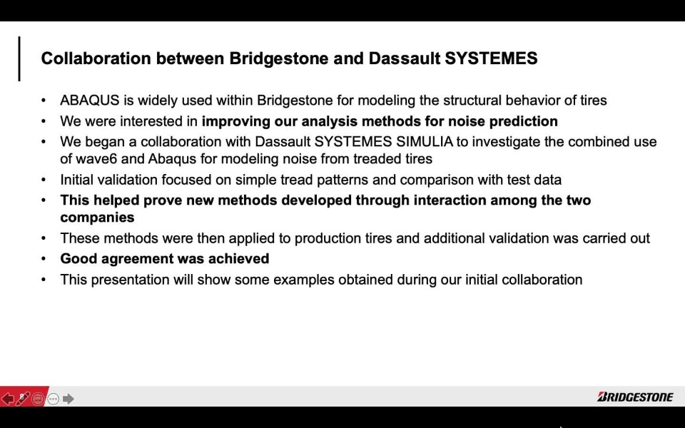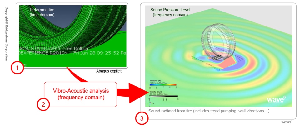 Tire airborne noise performance turned out to be a crucial one in the last years and for the years coming, challenging all the automotive field. Bridgestone tackles the overall tire performance optimization with a solid virtualization strategy. One of main focus is on tire exterior noise virtual prediction. This project presents the effort to adapt Wave6 technology to this target showing results obtained for a practical case study making us pioneer in applying this technology to create tire digital twin for noise prediction and also for vehicle virtual pre-development.