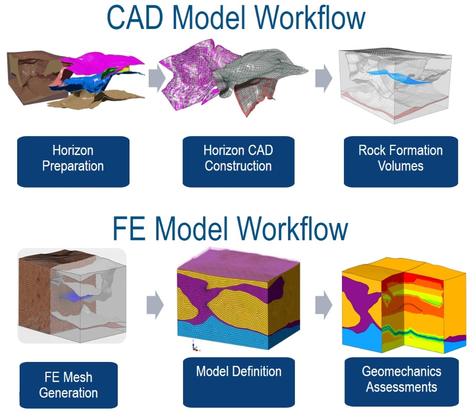 Mechanical Earth Models (MEMs) are finite element models that provide a first-principles physics-based description of an Oil and Gas field, describing the regional variations of stresses and strains throughout the field operational history. The MEMs are derivations of the subsurface modeling activities, tying information from multiple subsurface disciplines such as: geophysics, geology, petrophysics and reservoir engineering. Due to the nature of the geological data used as input to create the MEMs, the process of creating suitable finite element models is fairly manual, tedious and time consuming, with typical lead times in the order of months. A novel CAD-based workflow using Dassault Systèmes modeling technology is show cased in this presentation. The 3D shape modeling technology from Dassault Systèmes CATIA is proven to rapidly and efficiently recreate a CAD-based description of the oil and gas field, reducing modeling cycle time to a few days. The CAD-based 3D model of the field is subsequently taken through the steps to fully define a finite element model using Dassault Systèmes SIMULIA technology. The results of the model are presented following industry standards, making the interpretation of the model outputs rather trivial, with suitable technology able to democratize access to the model results by non-specialists.