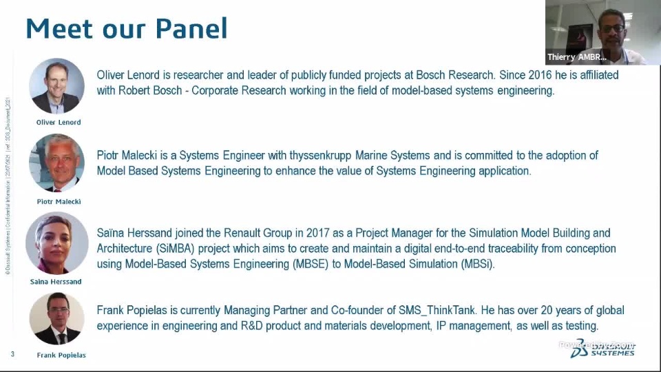 Saïna Herssand joined the Renault Group in 2017 as a Project Manager for the Simulation Model Building and Architecture (SiMBA) project which aims to create and maintain a digital end-to-end traceability from conception using Model-Based Systems Engineering (MBSE) to Model-Based Simulation (MBSi). | |
