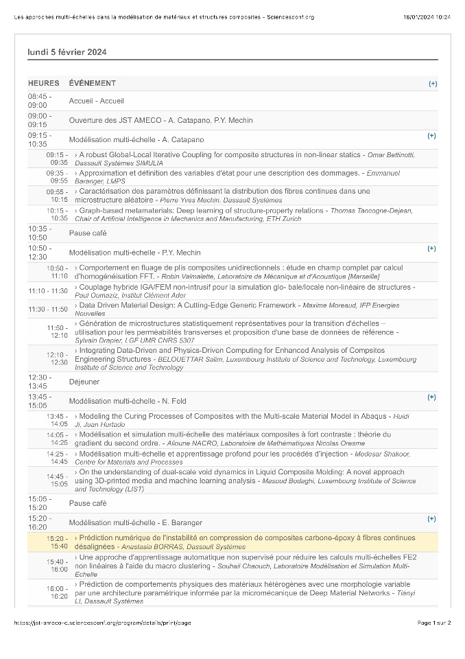 The next event is dedicated to multiscale modelling of material and composites structures. This day mainly aims to review the state of the art in terms of multi-scale modeling methods for the analysis and simulation of the behavior of composite materials. The themes identified concern: