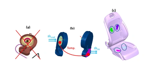 Figure 4: (a) Not simulating the radial fan, (b) mapping the mass flow temperatures for the fan, and (c) the fans positioned in the seat foam