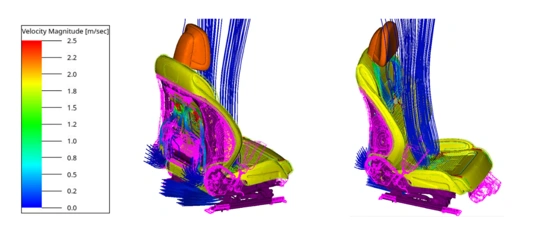 Furthermore, as was seen for the temperature data, one big advantage of performing computational fluid dynamics for the seat cool-down scenario is that one has access to the full-flow field data. As such, one can plot velocity streamlines to assess the directionality of the flow field. This was done and the results can be seen in Figure 10. Evidently, the poor cool-down correlation, both for the cushion and the backrest, but in particular for the backrest, can be clearly attributed to the unsatisfactory distribution of the cooler air throughout the perforated leather layer.