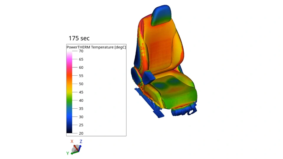 One of the main Transportation and Mobility (T&M) business drivers is the creation of novel customer experiences. No longer are customers just happy with traveling from point A to point B. They want to do so while experiencing a unique feeling in their vehicle. A major component of this is passenger thermal comfort. This well-being can be tuned through, for instance, the use of air conditioning or heating during hot or cold days, respectively. The most direct approach to satisfy passenger thermal comfort is to blow this cool or hot air through the interface between passenger body and vehicle seat, thereby creating a thermally regulated vehicle seat. In the past, design of temperature controlled vehicle seats, which includes the seat structure, foam layers, and fans, has taken place entirely on real-world thermal test benches. This approach is limiting though: one cannot access the full temperature or velocity field in the test domain. The current customer reference story aims to present a first-of-its-kind simulation workflow using a PowerFLOW–PowerTHERM coupled simulation to assess the thermal behavior of a vehicle seat provided by Lear Corporation. Lear Corporation is a global automotive supplier with sales of \\\$20.9 billion in 2022 alone. It is the most vertically integrated seating supplier in the industry.