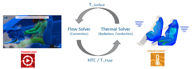More now to the actual simulation workflow and modeling of components, such as fan and seat layers. The PowerFLOW-PowerTHERM coupling works as follows. PowerFLOW, the flow solver, models the convective effects of the surrounding air. Then, the heat transfer coefficients and wall-adjacent fluid temperatures are fed into the PowerTHERM solver. It computes, for the designated time interval, the radiation and conductive heat transfer mechanisms for the solid components in question. Subsequently, the solid surface temperatures are fed back into the convective PowerFLOW solver. This process repeats itself at predefined coupling intervals and is represented by Figure 3.