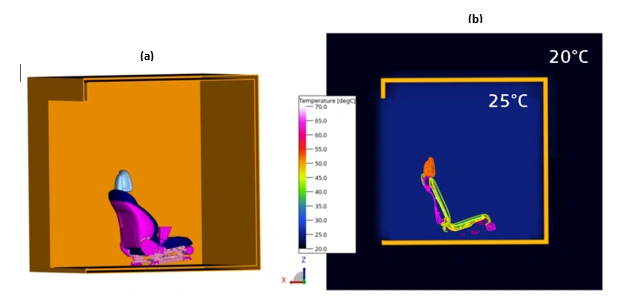 The real-world setup that is replicated in the digital domain consists of the following. The seat is positioned in a climate chamber with 25°C, while the air outside the chamber is set to an ambient value of 20°C (see Figure 2). In the real world, the seat is heated up by an infrared-lamp to 65°C surface temperature; in the simulation domain, this is merely imposed as a boundary condition on the seat surface’s leather layer. Subsequently, the lamp is switched off, the door of the climate chamber is opened and the air-conditioning of the seat is switched on. This represents when the simulation is initiated/started: the fans are turned on, blowing cool air through the seat layers.