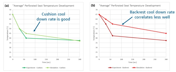 Overall, a digitized representation of the cool-down scenario of a heated seat from Lear Corporation has been presented and compared to experimental results. Good correlation was achieved for the cool-down rate of the cushion, since the area near the cushion cools down with time. Unfortunately, poorer correlation was achieved for the backrest, as the structures near the backrest stay hot with time, suggesting that the modeled conduction of the backrest components is not entirely accurate. The insufficient distribution of cool air through the leather layer with perforations could also be an explanation. Finally, this simulation opens up doors to more complex simulation scenarios, such as sequential coupling to a structural simulation to obtain a deformed seat, the assessment of comfort using a human comfort model, and/or an in-situ vehicle simulation of the seat.