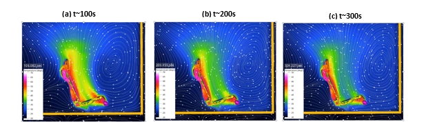 Figure 9: 2D temperature field at time, t, of (a) t~100s, (b) t~200s, and (c) t~300s