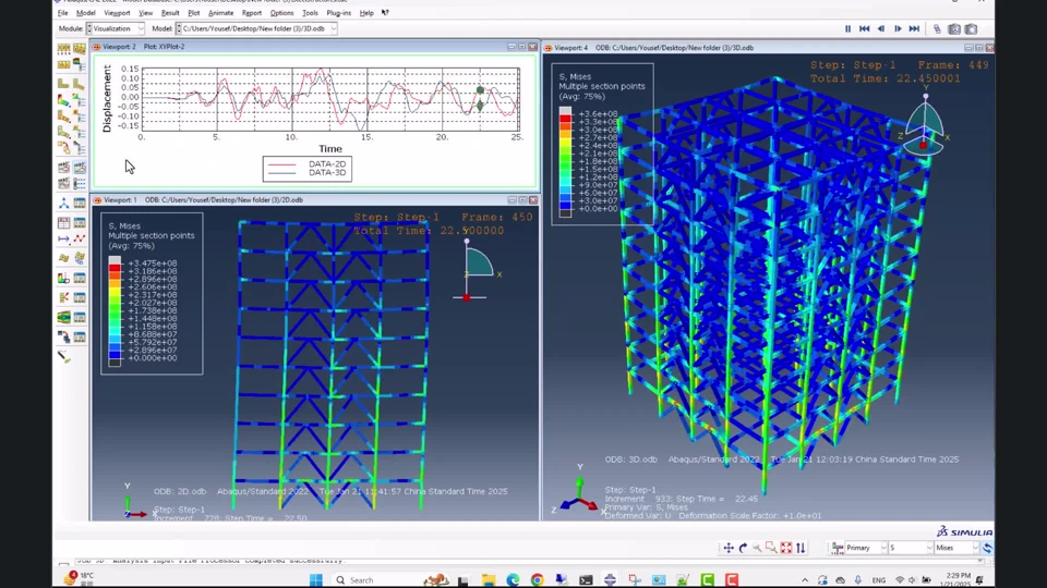 In this work, a ten-story building was put through an earthquake workout in Abaqus, enduring some serious stress! ๐ช๐ฝ The modeling was carried out in both 2D and 3D, with connectors simulating the joints and dampers. The buildingโs response to the earthquake load was tested, and displacement diagrams at the top were measured. The goal? To analyze how dampers can reduce vibrations and improve the buildingโs performance during a quake. This building is now totally unshakable! ๐๐ข