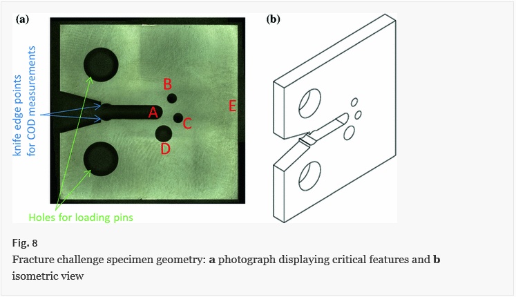 Sandia National Laboratory tested tensile specimens of 15-5 PH, a precipitation hardened martensitic stainless steel, and challenged a set of participants to predict the tearing force-displacement curve and the crack propagation pattern in a specially fabricated compact tension specimen. By "specially fabricated", it simply means that a special arrangement of a blunt notch "A", and circular holes, B, C, and D were fabricated in each specimen.