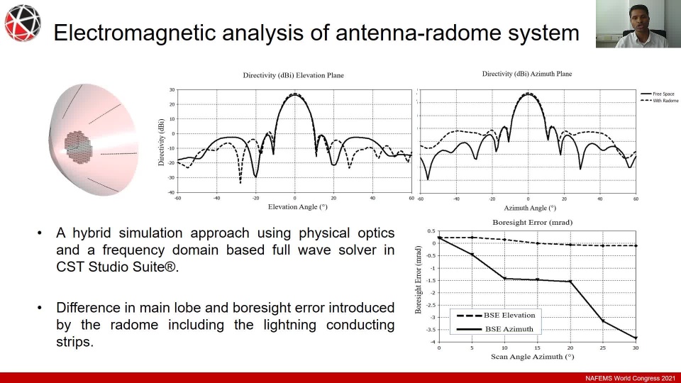 The model-based engineering approach offers an efficient workflow to automate the multiphysics analysis of the radome resulting in optimal designs for electromagnetic and mechanical performance of radomes. This approach enables early-stage design validation of radomes and accurate prediction of antenna behavior with the radome, thus reducing the amount for physical prototyping and therefore design costs.