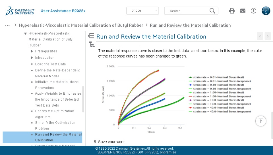 The example’s workflow begins with you importing multiple sets of stress-strain test data from test at different strain rates. You then select an appropriate material model to calibrate to your test data, adjust the initial material parameters, apply more weight to selected test data sets, and select an optimization algorithm. After you successfully calibrate the model, you export it as a new material definition in the 3DEXPERIENCE database. You can apply the new material definition to a product assembly for a future simulation, ensuring that the material’s response replicates real-world behaviors.