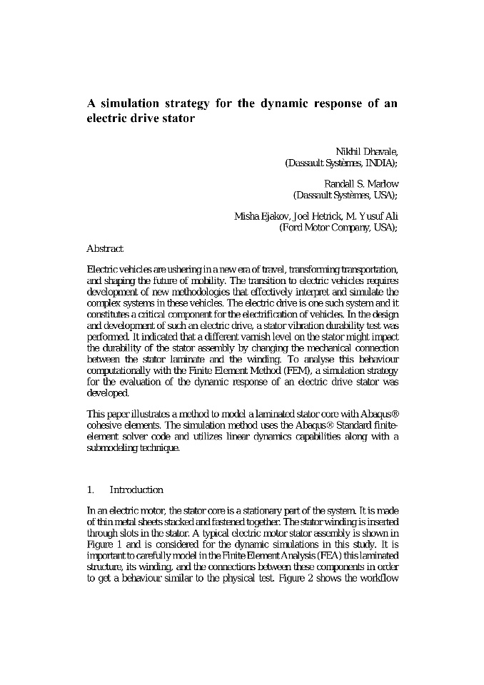 This presentation illustrates a method to model a laminated stator core with Abaqus cohesive elements. The simulation method uses the Abaqus Standard finite-element solver code and utilizes linear dynamics capabilities along with a submodeling technique.