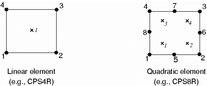 The expression “full integration” refers to the number of Gauss points required to integrate the polynomial terms in an element's stiffness matrix exactly when the element has a regular shape. For hexahedral and quadrilateral elements a “regular shape” means that the edges are straight and meet at right angles and that any edge nodes are at the midpoint of the edge. Fully integrated, linear elements use two integration points in each direction. Thus, the three-dimensional element C3D8 uses a 2 × 2 × 2 array of integration points in the element. Fully integrated, quadratic elements (available only in Abaqus/Standard) use three integration points in each direction. The locations of the integration points in fully integrated, two-dimensional, quadrilateral elements are shown in Figure 2.