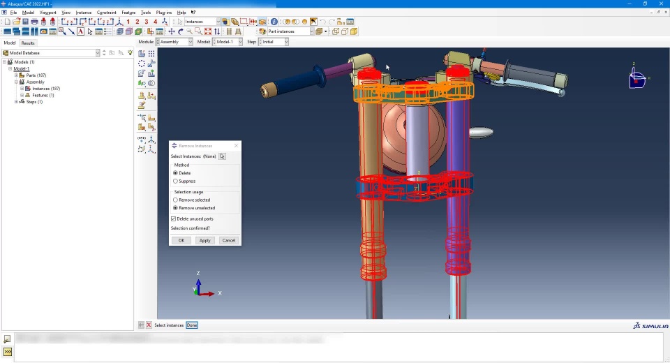 In Abaqus/CAE it is not possible to select instances in the viewport to delete or suppress them. The selection has always to be done in the model tree. This makes it quite hard and time consuming to work on a large assembly, especially when it was imported and the instance names are basically the same.