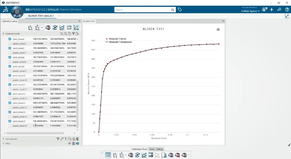 The video below is performed with a development version of the 3DX calibration app that is close to the 2020x FD02 release. This video was created on 04-09-2020 and shows a calibration of an isotropic, tabular, elasto-plastic material model.