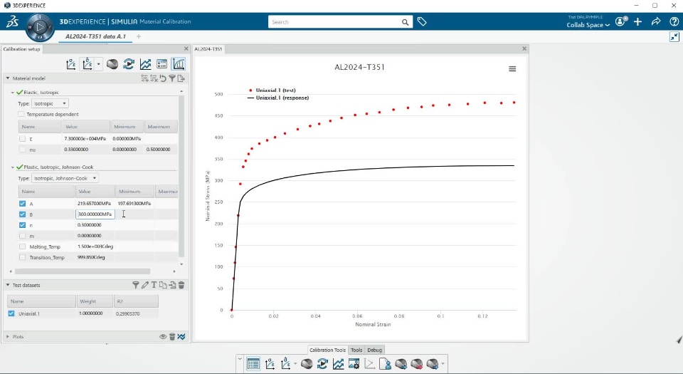 The video below is performed with a development version of the 3DX calibration app that is close to the 2020x FD02 release. This video was created on 04-09-2020 and shows a calibration of a Johnson-Cook elasto-plastic material model.