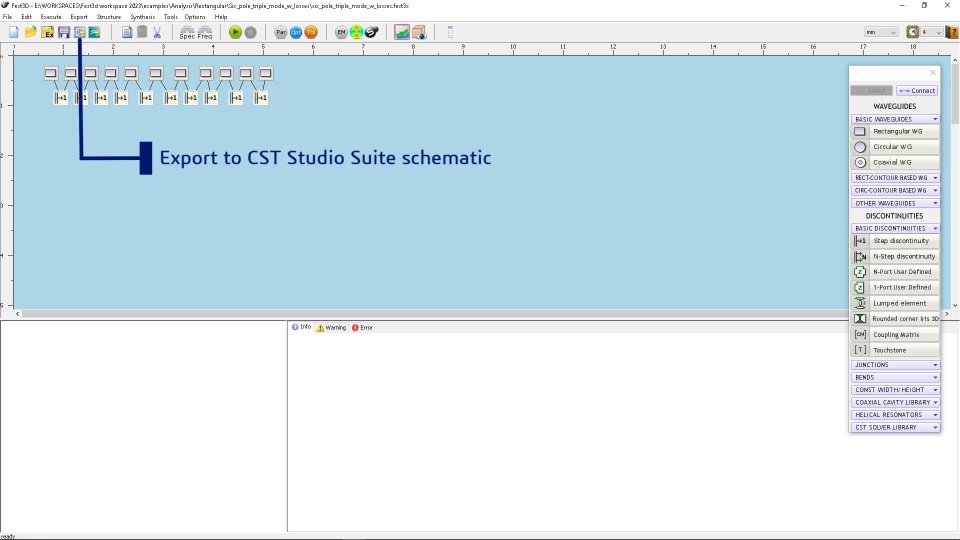 Finally, we demonstrate the link between Fest3D and the electromagnetic simulation tool CST Studio Suite. Importing a filter synthesized in Fest3D into CST Studio Suite allows users to embed the filter in a larger system, or to analyze and optimize the 3D geometry of the filter with CST Studio Suite technology. We show both how to import a Fest3D model into a CST Studio Suite project, and how to create a new CST Studio Suite simulation project from Fest3D with a pre-defined optimization workflow.