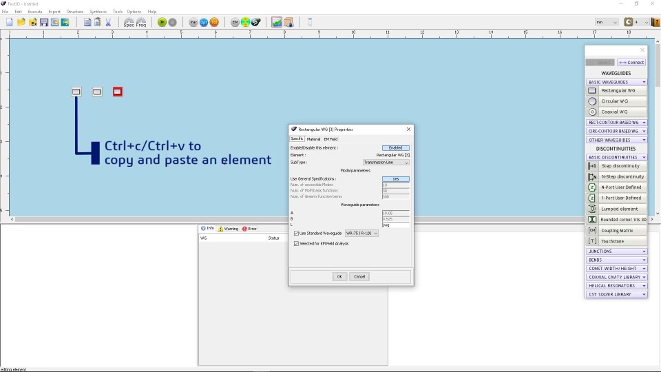 Next, we provide a step by step tutorial to create a Fest3D project. This tutorial covers the generation of the 3D model via parameters, the simulation set-up including the definition of ports and S-parameter sweeps and, finally, the simulation run and the output results.