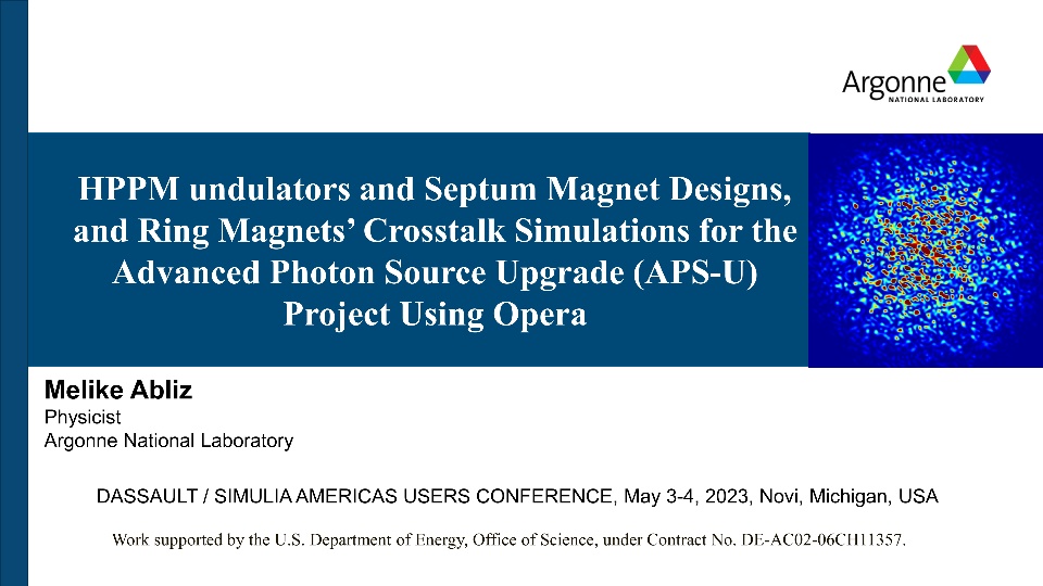Abstract: The Advanced Photon Source Upgrade project (APS-U) will replace the present storage ring of the Advanced Photon Source (APS) with a new storage ring based on a multi-bend achromat (MBA) lattice. For the APS-U, we have simulated magnetic crosstalk between the Q2 quadrupole and the adjacent M1 longitudinal gradient magnet using Opera for the minimum separation of 5 cm. Opera provided integrated dipole and quadrupole fields crosstalk effect of 0.01% and 0.16 between the M1 and Q2 magnets, respectively. We built those ring magnets and measured their crosstalk. We confirmed that Opera provided the crosstalk field between those magnets precisely. We introduced an advanced design structure to the hybrid planar permanent magnet (HPPM) undulators and simulated for different period lengths of 28 mm, 25 mm, 21 mm, and 13.5 mm for the APS-U. We built those undulators and confirmed Opera simulation results and introduced a novel design concept of canceling the septum magnet (DC) leakage field as an R&D of the APS-U project. We built a prototype of the septum magnet and measured its leakage field and confirmed that it matches the Opera simulation well. We will present our Opera simulation results of some magnets that we published already by comparing their results.