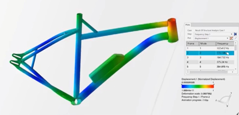 For the modal analysis, a frequency step is implemented, followed by the simulation step. Since the cloud version of 3DEXPERIENCE is being used, the choice can be made to solve either locally or on the cloud hardware. After solving, we can see the displacement animation for the bicycle frame.