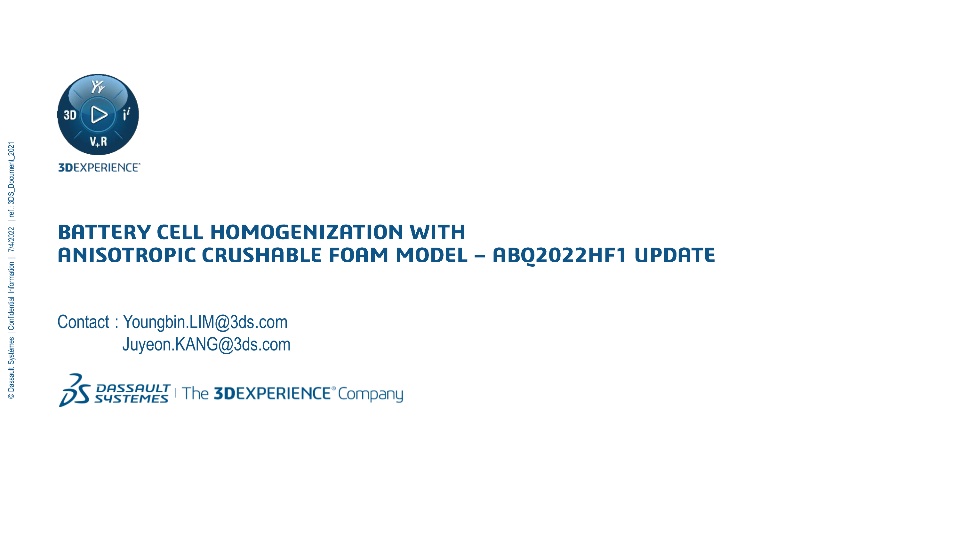 To predict thermal-runaway of battery cell from mechanical loading, deformation and failure of jelly-roll needs to be accurately modeled. However, detailed modeling of jelly-roll is too expensive for large scale models like EV crash or battery pack impact. The slides include battery cell homogenization procedure with Abaqus and Isight.