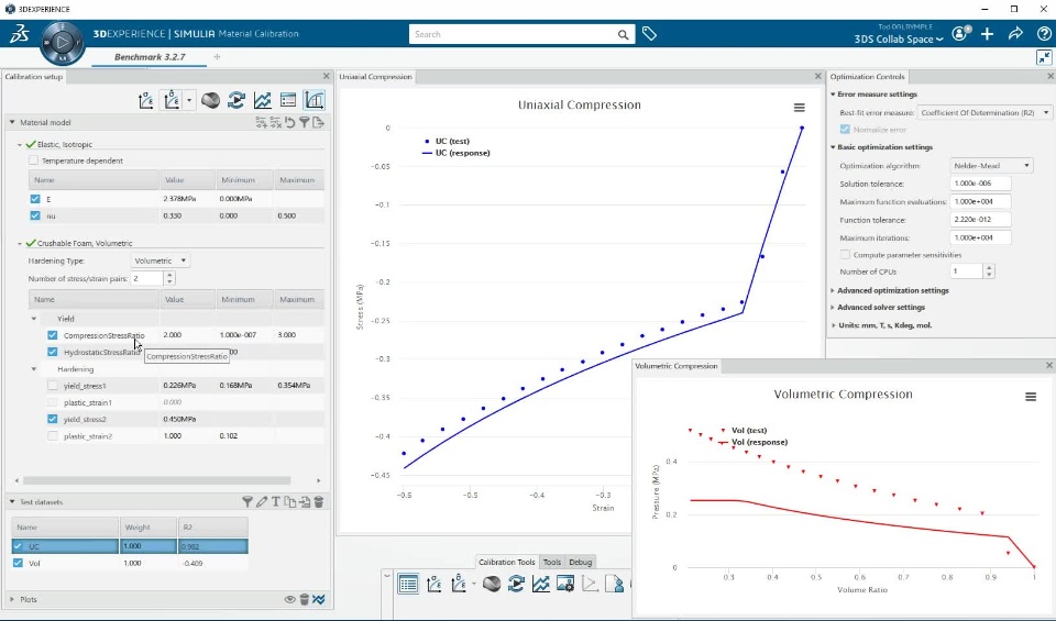 The video below shows how to use our 3D Experience calibration app to calibrate the hyperfoam material model using this Benchmark 3.2.7 test data. The crushable foam functionality shown was delivered in the on-premise 2020X FD02, aka FP2014, release.