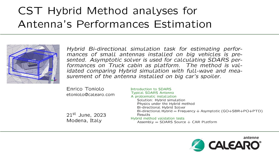We are pleased to share with you the presentation titled "Hybrid Method Analyses for Antenna's Performances Estimation", which Enrico TONIOLO presented at the SIMULIA Regional User Meeting EuroMed — Italy, in Modena on June 20, 2023.