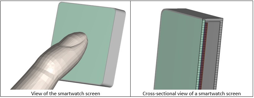 CST Studio Suite offers a library of human models, including models of human fingers. The import and placement of these models into the model of the smartwatch is straightforward. Normally, the finger potential is the same as ground. The effect of the finger on the electric field distribution and the capacitance matrix can be incorporated in the model.