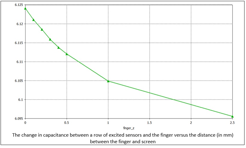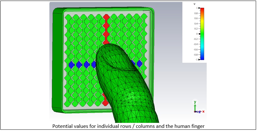 A parametric study has been performed for eight different positions of the finger, at varying distances from the surface of the screen (see image below). The change in capacitance for individual parts of the sensor grid is calculated. This calculation defines a sensitivity range for detection. As expected, the effect of the change in capacity is highest when the finger is closest to the screen and its effect diminishes as the distance increases.