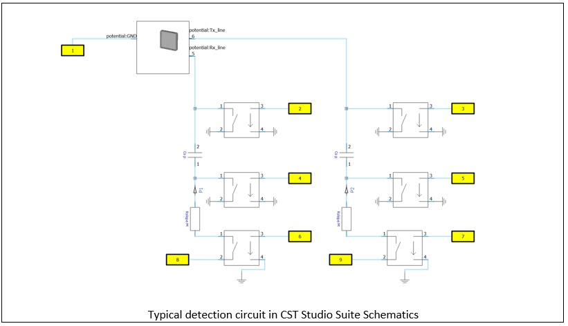The CST Studio Suite Schematic tool allows for rapid circuit simulations that include the representation of the smartwatch and finger finite element (FE) model by their equivalent capacitance matrix, previously calculated from a series of FE solutions for different finger positions.