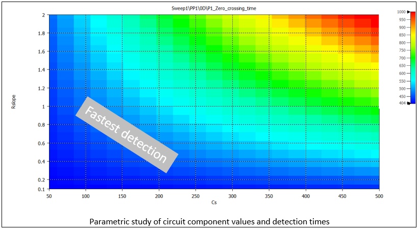 Very fast optimization studies can be performed to optimize the values of different circuit components (for example resistors and capacitors) to obtain the fastest detection time. The optimization can be performed in a matter of seconds or minutes, as it does not require rerunning of any new finite element solutions.
