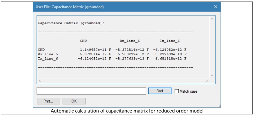 The software automatically calculates the capacitance between the rows and columns at different potentials and the ground using a series of electrostatic analyses. The resulting capacitance matrix fully characterizes the electrostatic behavior of the grid and can be used as a reduced-order representation of the FE model during circuit simulations.