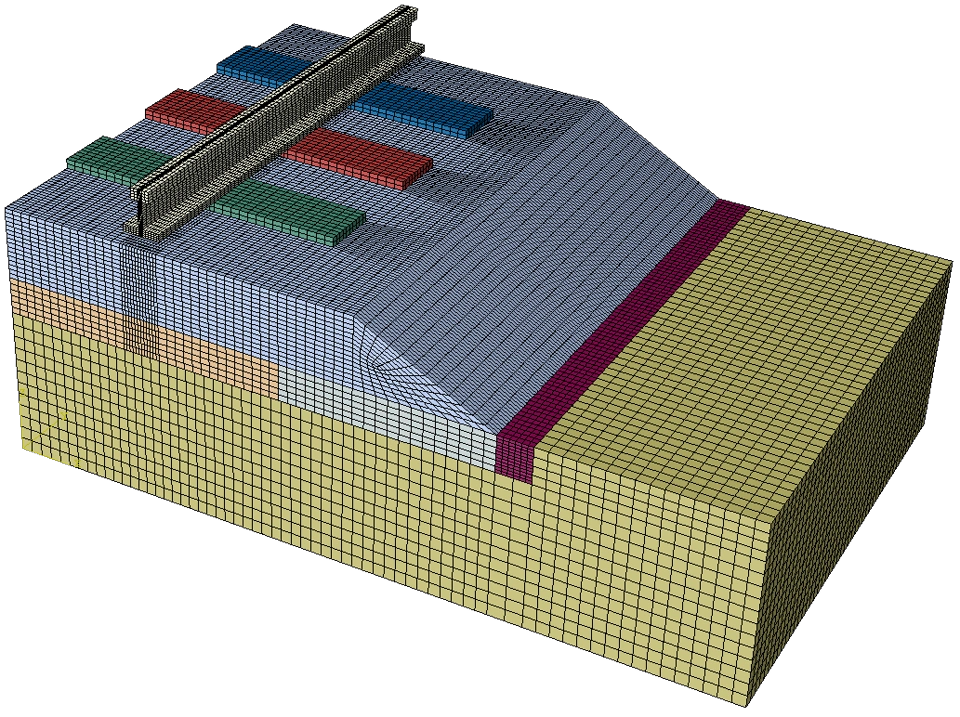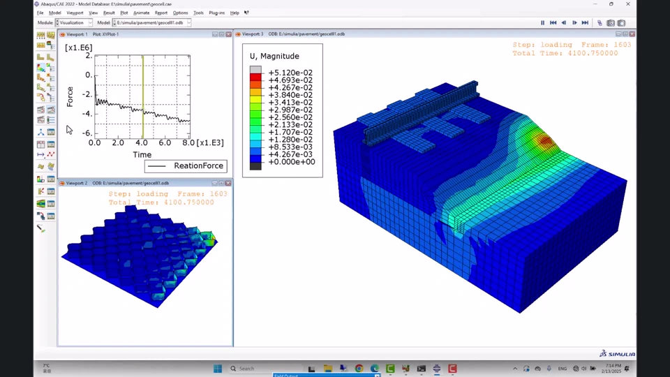 This simulation used Abaqus for cyclic loading on geocell-confined ballasted railroad foundations. The Drucker-Prager yield criterion was applied for ballast and soft subgrade. Hardening was used to simulate increased stiffness under repeated loading. The aim was to assess the impact of geocell reinforcement on reducing settlement and improving foundation performance. 🔧🏗️