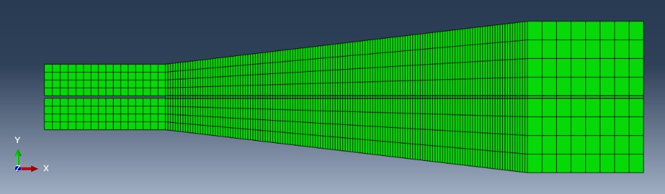 This zip file is the tapered DCB, per ASTM D 3433 as a .cae file. It was created in A/CAE 2022. It is run-ready and the model as meshed and loaded will run in about 20 seconds. The 0.3mm adhesive layer is modeled discretely with COH2D4 elements and the aluminum beams (arms) are modeled with CPE4I elements.