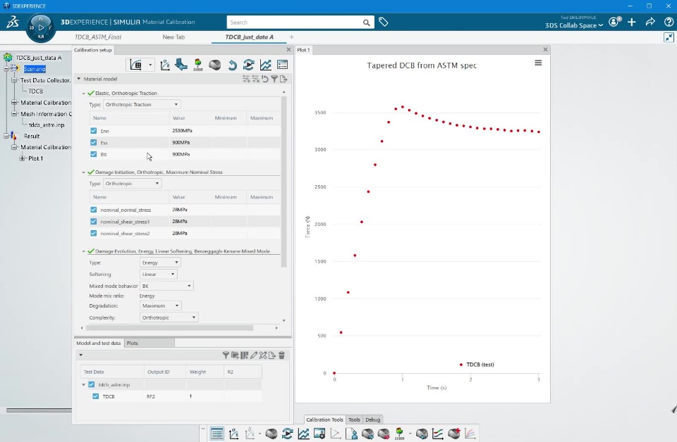 In the video below, I show the use of the calibration app to determine two of the Mode I related parameters. The video was created on Nov 30, 2022 using a development version of the app, which is similar to what will be released as R2023x FD01. Release date for the public cloud is scheduled for Feb 11, 2023. Units are N, mm, MPa, seconds. The Cohesive Traction Separation laws (material models) are only available in the FE mode. I should have mentioned in the video that I have set the total time equal to the total applied BC on the "top_node", and used a linear ramp of applied displacement. So, the plots say Force-Time, but are the same as Force-Displacement.